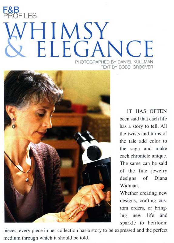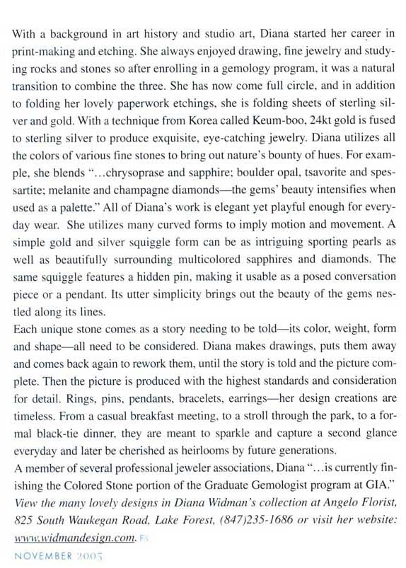 Now, as a designer for over two decades, Diana has custom created hundreds of original jewelry items. Each piece is rich with story telling components---the origin of the gemstones, the thought behind the styling, even the architecture of the design itself. These pieces are treasured collectibles to be lovingly cherished by a new generation someday. Because she’s also an expert metalsmith, she understands the movement of earrings, and how a necklace must sit on the wearer. View a few pieces of her custom designed jewelry.