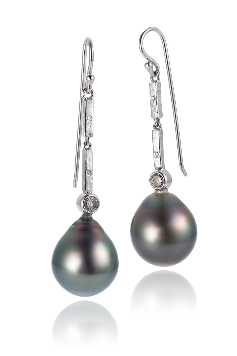 Juicy Baroque Tahitian pearls on reticulated Longstem crafted of hammered white gold and set with F,VS diamonds. Super comfortable and light-catching, these will become a “go-to” pair for every day. They are 1.8″ long. Pearls are 15mm long and 13 mm wide. This pair is a stunning blend of steel gray as the base color, striated with rose and greenish blue. They glow.