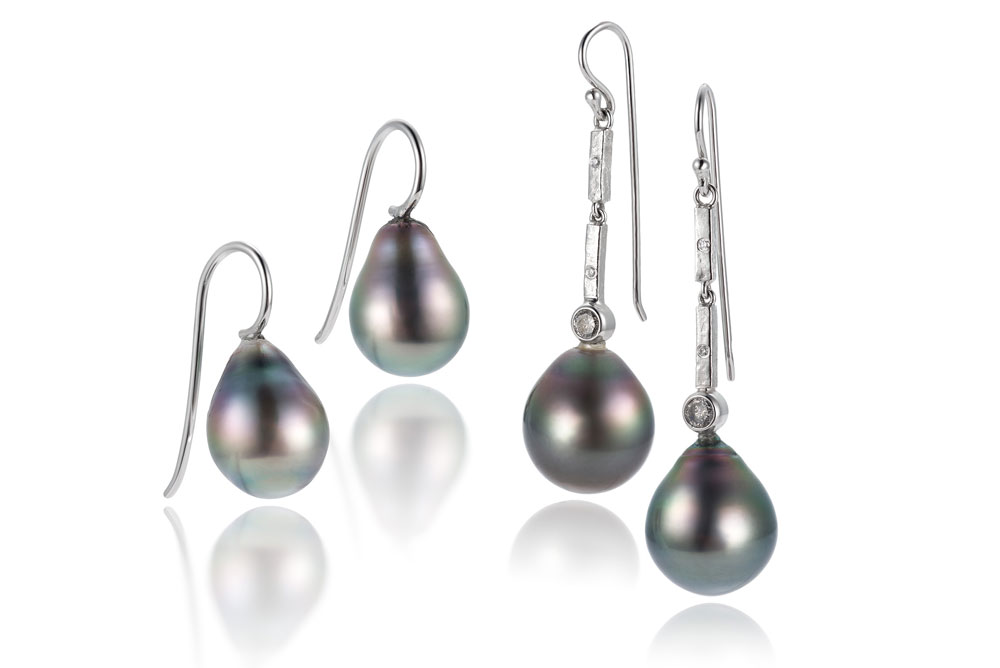 Tahitian pearls have general color categories: gray, black, blue, pistachio…but each pair has its own color palette. This phenomenon makes for a beautiful interplay of color.