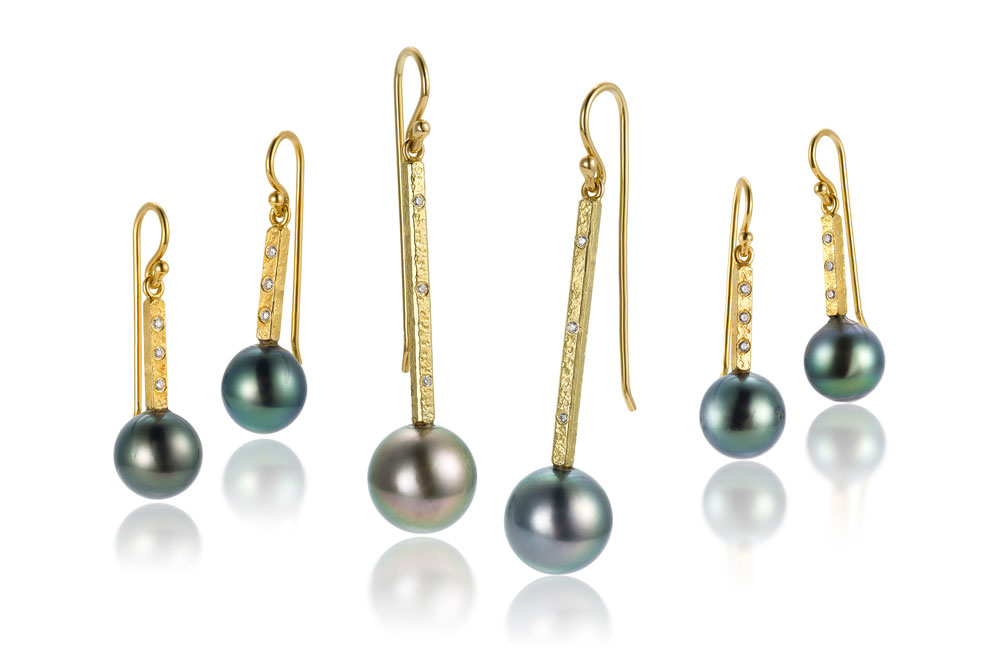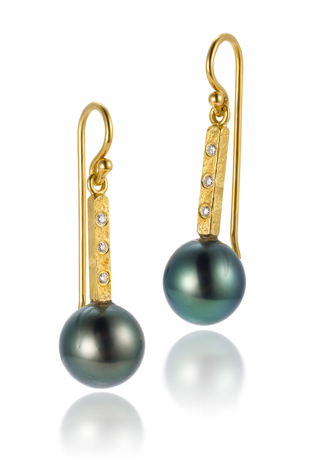 The blue pearl stem earrings combine one of the rarest pearl colors with the richness of high-karat (22kt) gold. Accented with F color, VS diamonds, these 1.25” long earrings will become your “go to” pair for elegance for every day. These blue pearls are high-luster, 9mm round ocean gems.