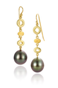 Tahitian pearls have general color categories (gray, black, blue, pistachio), but each one has its own unique color palette. This phenomenon makes for a beautiful interplay of color.